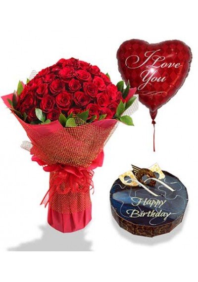 birthday flowers cake balloons30 red roses, birthday chocolate cake & balloon