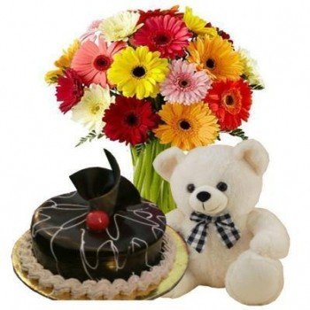 A Roaring B'day WishCroon up a birthday song for your friend/ loved one with this gift.(20 mix gerbera bunch with chocolate cake & 8 inches small teddy ).