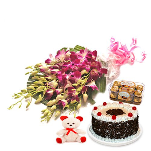 Effective ComboYou will love this idea! It's a great, cost-effective combo to have an amazing decorated cake lipsmacking, delicious creamy chocolaty filling inside with crispy wafer chocolates, soft touch warm teddy bear with long lasting, twin purple color Orchid is stunningly presented to let that someone special in your life know they are on your mind. Combo consists bouquet of 6 purple orchids with seasonal foliage in cellophane Packing & matching ribbon. 200 gms Ferrero Rocher Chocolate Box & approx 8 inch height Soft Teddy Bear along with yummy Black Forest Cake