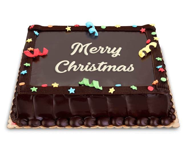 MERRY CHRISTMAS CAKEA delightful combination of chocolate cookie crumb crust, light caramel mousse filling w/ suspended cookie pieces topped w/ whipped cream frosting, chocolate cookies & chocolate syrup.