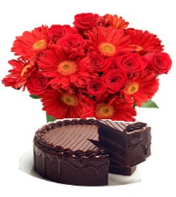 Sweet and thoughtful12 red roses and 12 red gerbera in a bunch type bouquet that shows how thoughtful are you and a chocolate cake for your sweetness.