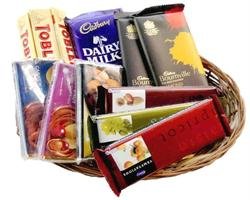 Chocolate Hamper - 8Cadbury Bars - 3 Nos ,65 gm each Vochelle Choco Bars - 3 Nos ,40 gm each Cadbury Bournville Bars - 2 Nos Cadbury DairyMilk Silk Big Bar - 1 No ToblerOne Chocolate - 300 gms