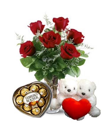 1'll be there for you6 Red Roses with Couple Bear Heart , pilow and Ferrero Chocolates. Perfect for your Valentine's Gift