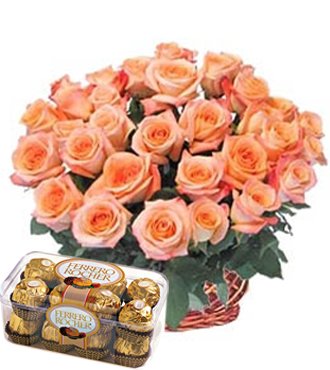 Basket with Roses & Ferrero36 orange roses Basket with & Ferrero 200g