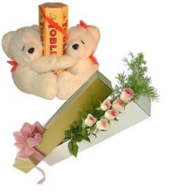 Deeply in loveCouple bear with 6 pink roses and 6 * 50 grm toblerone chocolates.