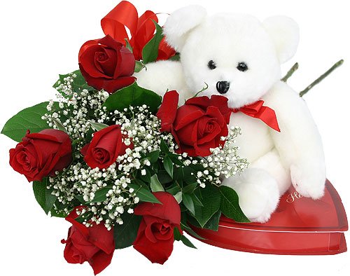 Love you forever6 roses bouquet with heart shape Hershey kisses and 9 inches teddy bear.