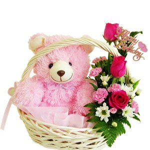 Pinky ParadiseDescription Find paradise and color it pink with this exciting hamper. A pretty pink roses arrangement comes with a super cute pink Teddy bear in a basket. 3 Pink Roses With Medium 9 "Teddy Bear In Basket