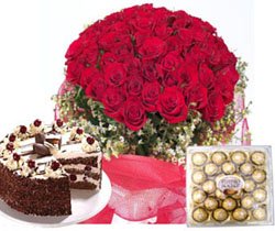 Sending thisLong to see your special person once more? Let her know it by sending her these 36 of red roses with gorgeous glass vase,24 pcs ferrero rocher chocolate and chocolate torte cake. Your gift will come with a greeting card and your message.