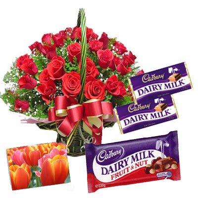 The Queen of HeartsSend 24 Red Roses Basket, 1cadbury milk 165 g 2 Cadbury Fruit & Nut (65 rgm each) with a Free Greeting valentines Card with your message