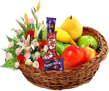 Fruits | Flowers | Chocolate5 items Fruits, Flowers , Chocolate arranged in a Basket.