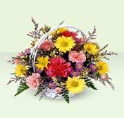 Never You FarThis sweet arrangement of yellow daisies, pink mini carnations, and hot pink carnations is complemented by purple monte casino and white waxflower. Designed in a handled basket, it's sure to send your special greetings with style.