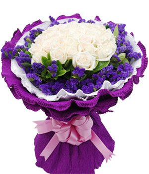 36 White roses36 White roses, purple forget me rich periphery, lining a white or light-colored lines curling paper, round paper packaging for external use purple curling