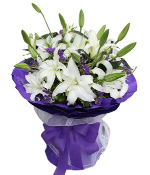 9 White Lily BouquetExquisite white lilies bouquet: 9 perfume white lilies with forget-me-not, solidago, gypsophila decorated; Purple color crepe paper round hand bouquet.