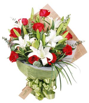 Donn ToutRed roses 9 stems, white lilies 3 stems, match green. English news paper and with gauze packed, finished with bowknot.
