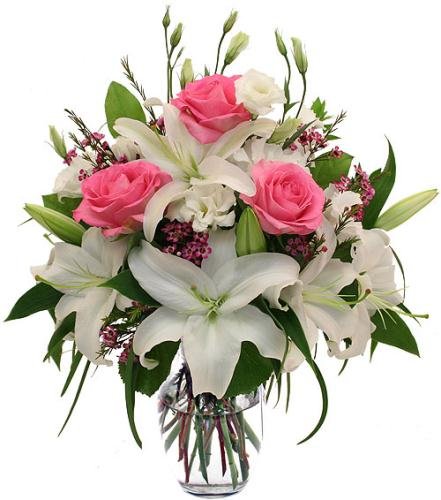 LOVING BOUQUETNothing tells your loved ones how much you love them than this gorgeous sophisticated flower bouquet. Pink roses and white lilies are delicately hand arranged with other flowers of the finest quality.