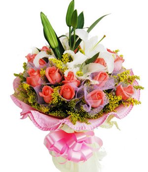 My all World16 pink rose in independent packaging with 2 white perfume lilies, match solidago. Send round style bouquet express feelings of because I have already filled your heart, you're my whole world.