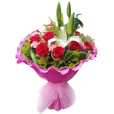 Rising BeautyDescription 12 Red roses 16 Pink carnations 2 White lilies Goldenrod flowers (Solidago) to decorate
