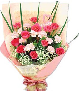 Thank You Mother11 pink carnations,11 pink red roses, match leaves and baby`s breath. Pink tissue to pack, pink ribbon to tie. Note: pink carnations may be replaced to red carnations for different area.