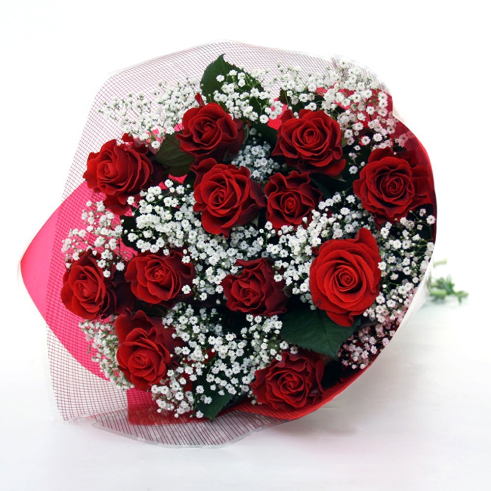 Romantic 12 Red Rose BouquetThis luxurious Romantic 12 Rose Bouquet is made up of the most beautiful red Roses nestled amongst soft white gypsophila and presented in a red floral wrapping. This is the classic way to say 'I Love You'. Each bouquet is individually made and sent with flower food, care instructions and your own personal gift message.