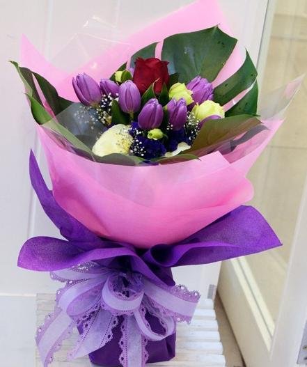 CONTE DE F��ESThis hand bouquet comes with 12 stalks of tulips and one roses in the middle. It is also mix with eustoma flowers and beautiful leaves.