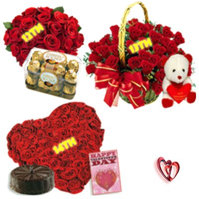 Eminent Love WishesHow surprising to your loved ones when their Special valentine day begins 2 days earlier. Send this lovely Hamper countinuosly for 3 days which includes : 12th Feb - Bunch of 12 Red Roses along with Ferrero Rocher Chocolate Box (Net Weight : 200 gms) 13th Feb - 24 Red Roses in Basket Arrangement along with Cute Teddy Bear (Size :8 inches) +pillow 14th Feb - 36 Red Roses Heart Shape Basket Arrangement along with 1/2 Kg Chocolate Cake + Valentine's Day Card. -