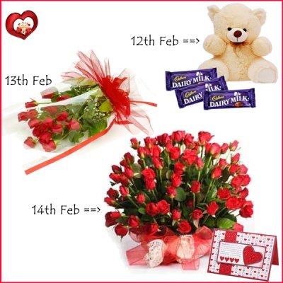 Valentine's 3 Days FantasyTo impress your loved ones send this lovely not only for one day, but its for three days which shows how much they mean for you and its simply reflect your love. This 3 Days Serenade includes : 12th Feb - A cute teddy bear (8 inches) with 3 bars of cadbury dairy milk chocolates (60 g each) 13th Feb - Bunch of 12 red roses. 14th Feb - Bunch of 24 Red Roses with a special Valentine Greeting Card.